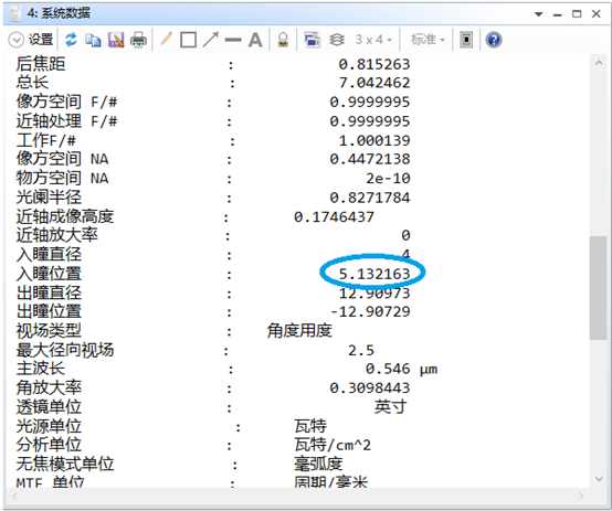 这时候我们就明白了,那么首先找到入瞳的位置关系,打开源文件的序列模式,在报告,系统数据中找打入瞳位置,可以看出,此时的入瞳位置是5.132163mm处。