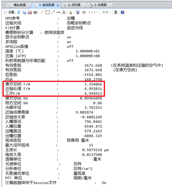 像方空间F数:近轴有效焦距与近轴入瞳直径之比,这里的近轴有效焦距为2672.6675465152mm,入瞳直径为796.8440613641mm,二者相除得到像方空间F数为3.3540659661,与数分析报告上一致。
