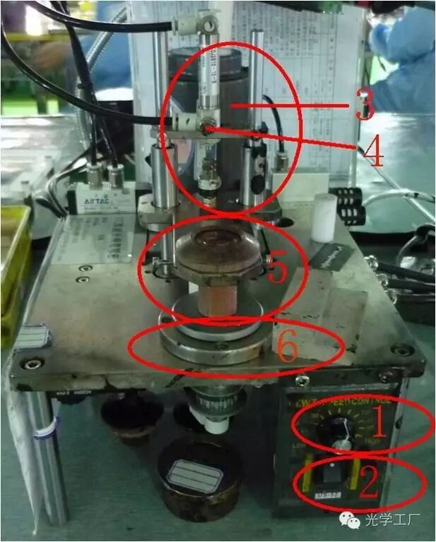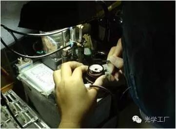 一个镜片上点上胶水,将另一镜片放上去,胶水固化前通过中心仪上调整镜片的偏心,偏心调整OK后强曝光将镜片初步粘合在一起,再经过UV烘箱弱紫外光光长时间UV照射,使得胶水完全固化,将两个镜片牢牢的胶在一起。
