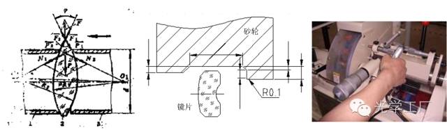 将定芯后的镜片,对称的磨外圆,并对倒角、矢高、台阶等进行加工。