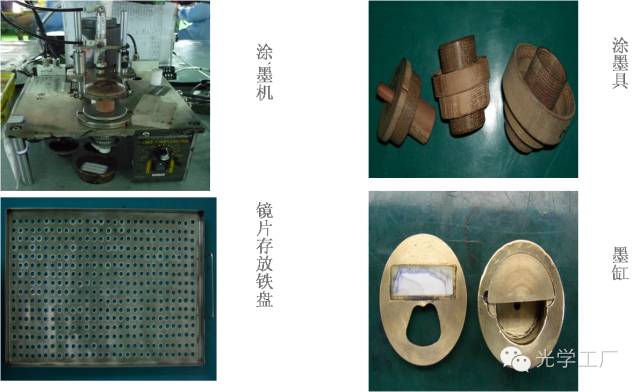 镜片放在涂黑具上,沿自身轴线高速旋转,使用海绵或毛刷蘸上油墨,在边缘均匀涂抹上油墨,油墨经过高温烘烤后,在镜片边缘形成均匀牢固的黑漆。