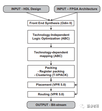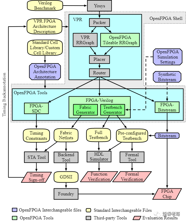 下图是一个 开源的FPGA的设计流程(OpenFPGA),我们可以看看,即使一个开源项目,其涉及到的EDA工具最少都要有哪些?