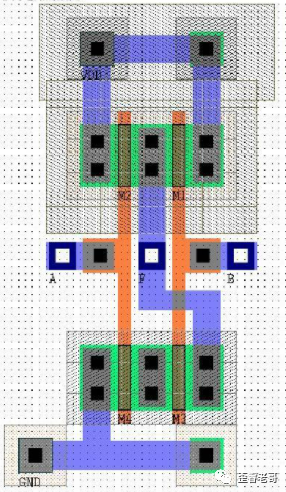 其功能就是二输入与非门。这是一个最简单的芯片,其电路和版图如下