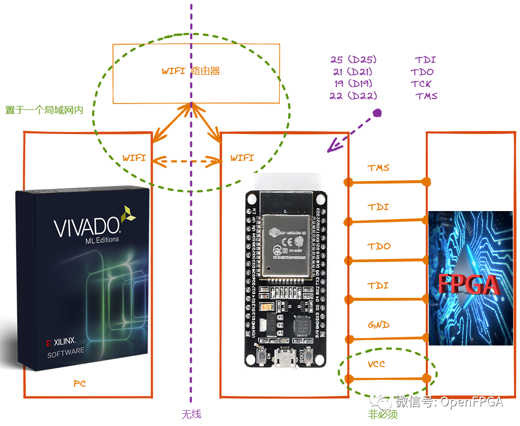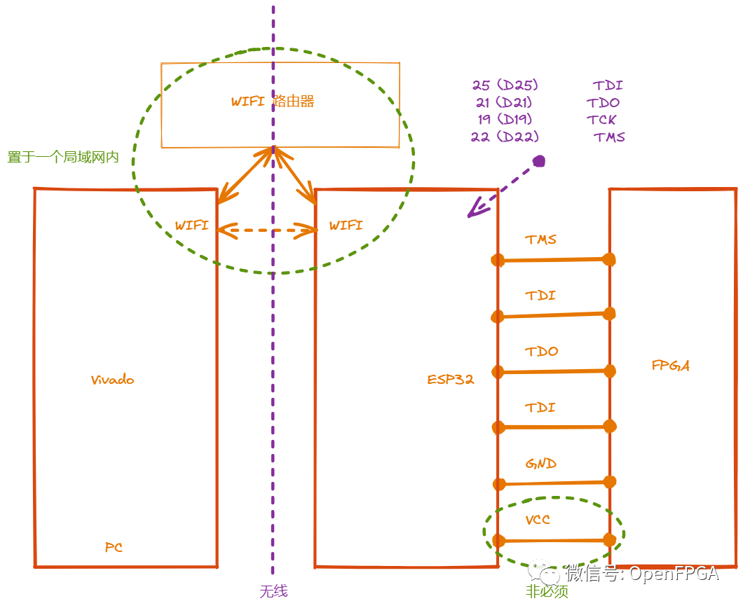 上边是整个框图,主要的数据流是Vivado通过PC上的WIFI链接到WIFI路由器上,然后对同一个局域网内的ESP32模拟的JTAG进行管理,当然也可以直接使用PC上分享的WIFI热点进行管理,主要是保证Vivado上所在的PC wifi和ESP32所在的wifi处于同一个局域网内,这里面主要应用的原理就是AMD公司提供的XVC。