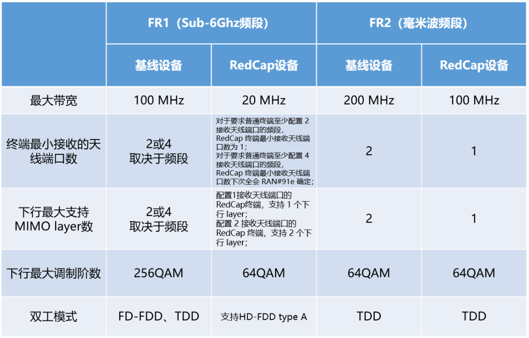 下面这个表格,显示了5G RedCap设备和5G传统设备之间的主要区别。