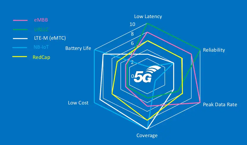 从技术特性上来说,RedCap介于eMBB(超宽带)和LPWA(低功耗广域网,NB-IoT等)之间。