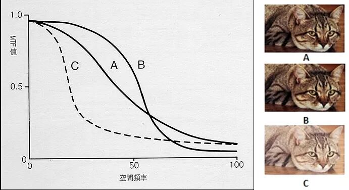 曲线C表示镜头在低频时MTF衰减就很快,综合性能较差。从图C中也可以发现画面深浅色反差较低,层次感较差。