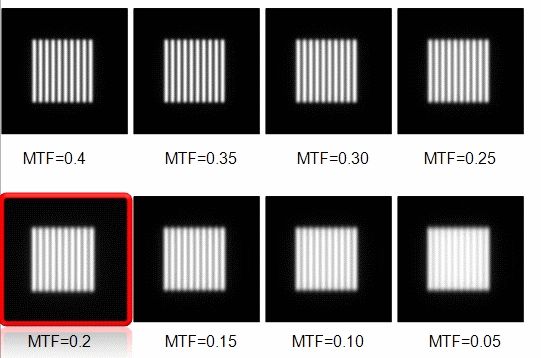 MTF是实际像与理想像之间①调制度之比相对空间频率的函数,通俗讲就是测量不同空间频率下镜头反差的还原程度,它能同时反映镜头的反差及分辨率。因为实际光学系统存在像差、反射、吸收等因素,影像与标版反差无法完全一致,所以MTF总介于0~1之间,MTF值越大,图像越清晰。如图一,MTF=0.4时最清晰;MTF=0.05时,图像最模糊。
