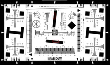 SFR数据处理过程通过图三表述,这里不过多讲述。用于SFR计算的斜边分为两种,一种是水平斜边,一种是竖直斜边。如图四两个红色框,宽度比较大的称为水平斜边,高度比较大的称为竖直斜边,其中我们测试水平方向的锐利度时是使用竖直斜边,而测试竖直方向锐利度时使用的是水平斜边。