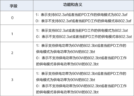 TLV Type:TLV的类型,占1个字节。取值为1,表示PD支持的供电模式;取值为2,表示PD当前工作的供电模式。