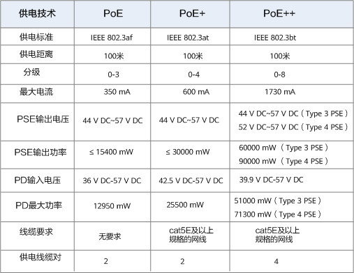 一般将IEEE 802.3af标准对应的供电技术称为PoE供电,将IEEE 802.3at标准对应的供电技术称为PoE+供电,将IEEE 802.3bt标准对应的供电技术称为PoE++供电,也称为4PPoE。三种供电技术对应的参数如下图所示。