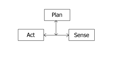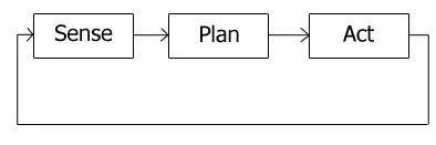乍看起来,这与当下的机器人设计并无差异,只要该循环运行得足够快,似乎可以解决很多封闭环境下的问题。但由于分级范式会约束系统在运行规划模块时,停止感知和执行模块,这就造成了当前规划的内容,永远都是过去感知到的内容,如果在规划或执行过程中发生了感知信息变化,系统将无法得知。而隔离的结构也造成执行程序无法获取到感知信息,以满足执行层的准确计算(如果需要的话)。如图所示(摘自《Introduction to AI Robotics》),感知层(SENSE)的信息只会流向规划层(PLAN),而执行层(ACT)仅能严格执行规划层给出的指令。用最简单地话讲,分级范式的机器人的工作逻辑是,看一眼,想一步,走一步,再看一眼,想一步……