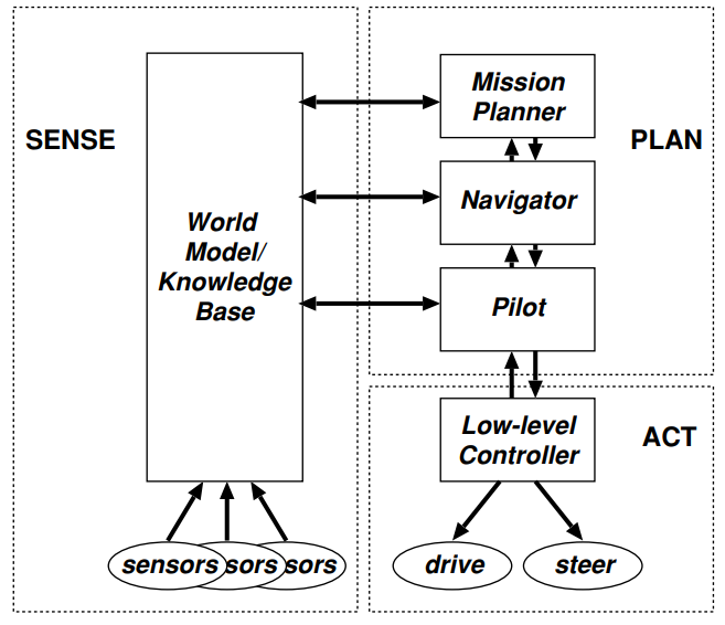 分级范式所指的是机器人会按照1.感知、2.规划、3.执行的步骤依次重复运行,来完成其自身的任务。如上图(图片来自维基百科)所示,三个步骤相互隔离,彼此仅通过预先设计好的接口进行数据交互。所有通过传感器获取到的信息都会通过感知模块进行处理,然后将结果输出至规划模块;规划模块会根据先验知识和已有模型,对接下来要执行的动作进行规划,并输出指令;执行模块最后再将指令转换为实际的运动控制命令,并完成执行。