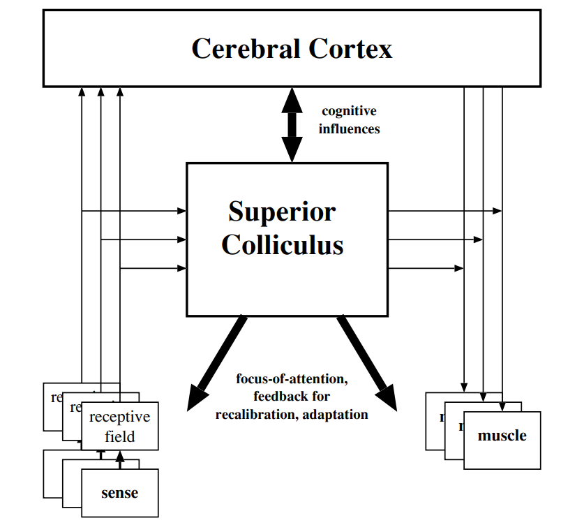 最高层的任务规划器只会向下提供抽象的规划指令,随着层级的下降,抽象的指令会一步步被细化,最后成为确定的执行命令。而感知信息则会贯穿整个系统,任何一层的模块都可以直接获取到感知信息的内容,并根据感知信息生成其对应的结果。下图(摘自《Introduction to AI Robotics》)展示了人类的认知模型,当下许多机器人软件的实现也都遵从此类模型。