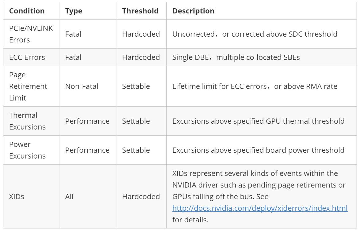 2) Error,检测到关键问题,目前的job可能会受到影响甚至中断,这种情况通常会引发致命的RAS事件,需要终止当前执行的工作,并执行GPU健康检查。