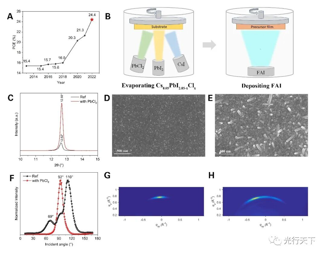 真空蒸镀钙钛矿电池效率进展图、蒸镀工艺示意图和前驱体形貌表征图