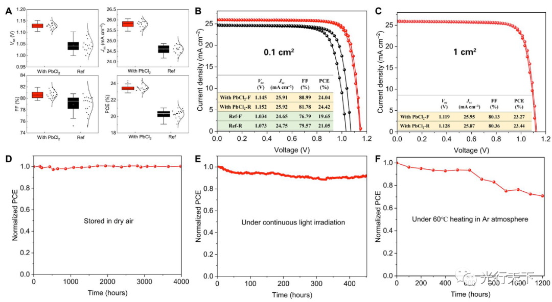 通过该方法制备的太阳能电池表现出了优异的光电性能,在AM1.5G标准光照下取得了最高24.42%的光电转换效率,刷新了真空蒸镀法制备钙钛矿太阳能电池的效率纪录,在1cm2和14.4cm2的大面积器件上分别实现了23.44%和19.87%的光电转化效率。此外,真空蒸镀法制备的太阳能电池表现出了良好的稳定性,在干燥空气中存储超过4000小时后无衰减,在湿度为35%的环境空气中储存1300小时后仍然保持97%的初始效率。该研究结果展示了真空蒸镀工艺在制备大面积高效率钙钛矿太阳能电池的优越性和产业化应用的可行性。