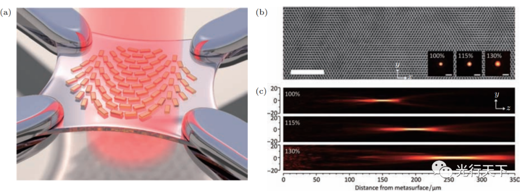 图 5 (a) 可拉伸超表面示意图; (b) 可拉伸超透镜的扫描电子显微镜图; (c) 测量的光场分布