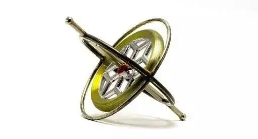 最早的陀螺仪的简易制作方式如下:即将一个高速旋转的陀螺放到一个万向支架上,靠陀螺的方向来计算角速度,简易图如下图所示。