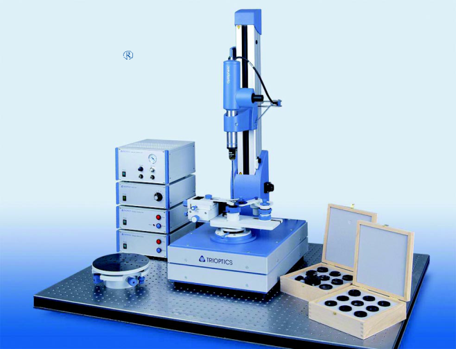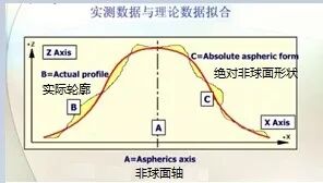 模造玻璃成型后,借助一些仪器对其进行检测。下图a所示的UA3P可以用来测量产品的面精度等;b所示的高度计用来测量产品的芯厚;c所示工具显微镜用于测量产品的外形尺寸等。 图五 理论上来讲非球面表面任意一点的曲率都是不同的,要衡量模造镜片精度更重要的在于面精度和偏心的测量。 一般来说使用轮廓仪(Taylor surf、UA3P等设备)进行面精度,其原理是根据探针在镜片上的接触走过的轨迹,扫描出表面的轮廓形状,用于非球面量测和表面粗糙度量测来测定非球面形状和设计非球面形状之差。下图六所示曲线C代表的是设计上的非球面轮廓,曲线B代表的是实际扫描所得的轮廓。 图六 偏心检测:一般使用TROPTICS偏心仪检测透过偏心、反射偏心、非球面面间偏心以及镜头组面间偏心。 图七