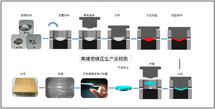 一般包括以下流程:玻璃初胚的制作→加热成型→退火处理→量测→芯取→镀膜→涂墨等工序。较详细过程如下图二: 图二 采用模造成型法相比传统的人工研磨法缩短了制程时间,精度也更高,玻璃非球面镜片的加工方法普遍采用的是模造成型法。