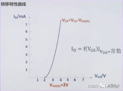 根据MOS管的输出特性曲线,可取得到相应的转移特性曲线。反应了 MOS管的特性,通过 Vgs的电压来控制 ID(导通电流), 压控流型器件!