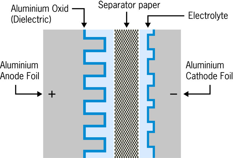 图 1:电解电容器主要由阳极和阴极薄膜、隔离纸和电解质组成