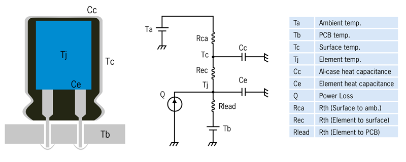 如果用户希望自行进行计算或模拟,可以从供应商处获取从电容器的核心(绕组元件)到接腿以及封装的热阻模型。